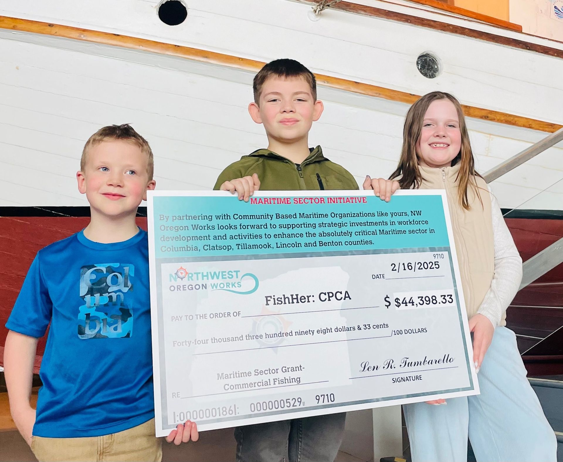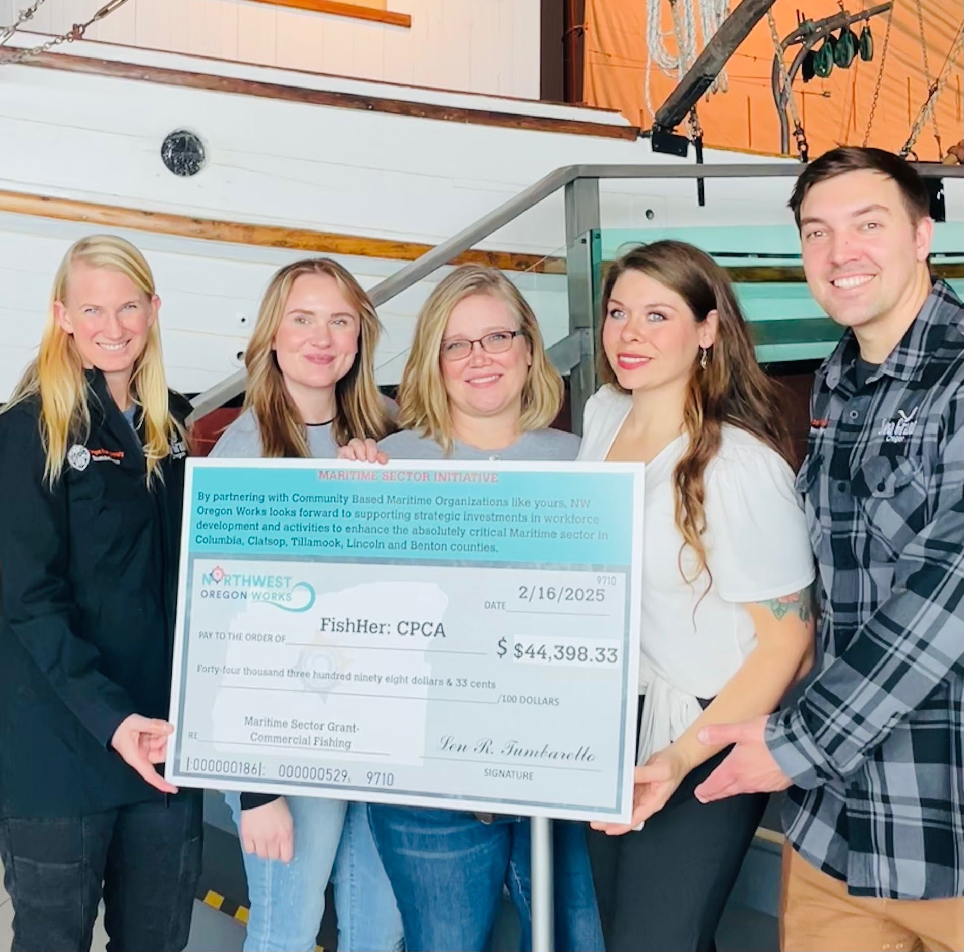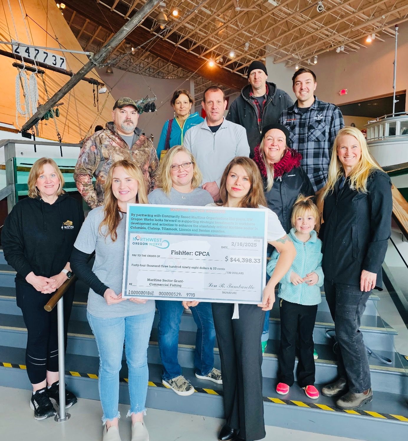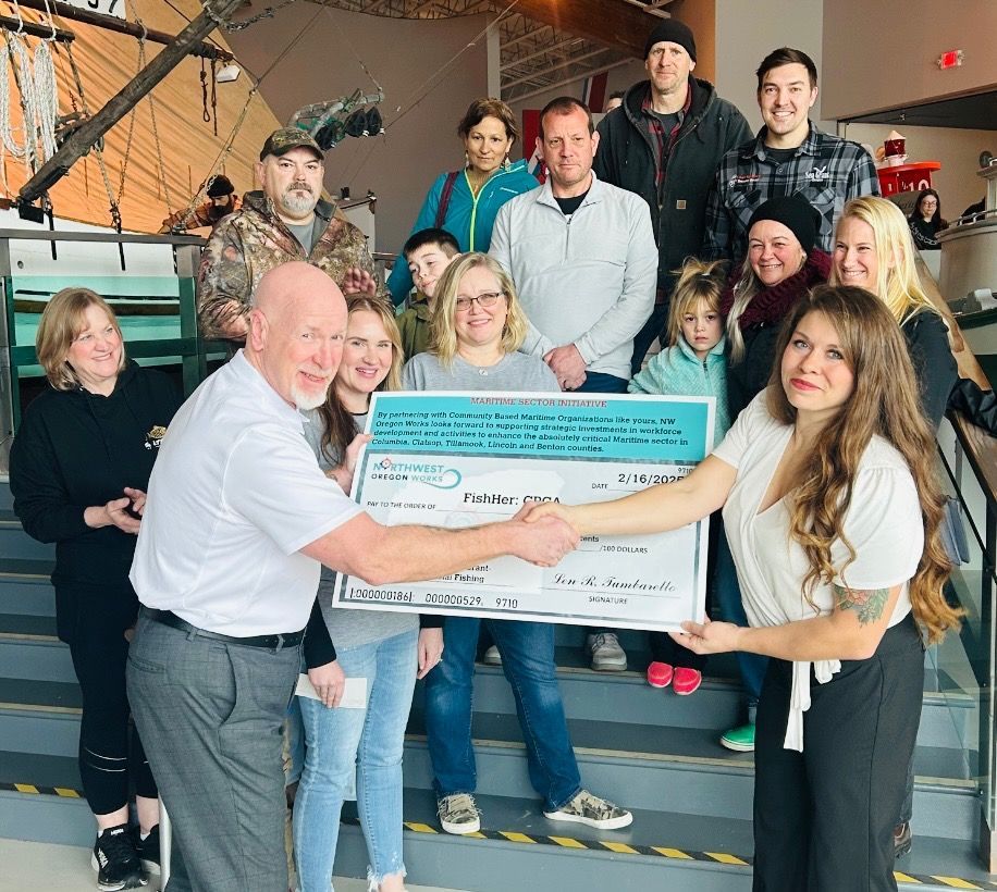 Sunday, February 16th was an incredible day for the commercial fishing fleets in our region. FishHer received our first grant funding from NW Oregon Works to purchase life vests, survival suits, and commercial fishing licenses to distribute at our 1st annual Commercial Fishermen’s Appreciation Lunch, April 12th, from 11am to 3pm, at Englund Marine & Industrial Supply in Astoria. Thank you to Columbia River Maritime Museum for allowing us to receive the big check in an environment rich with our region’s maritime legacy.